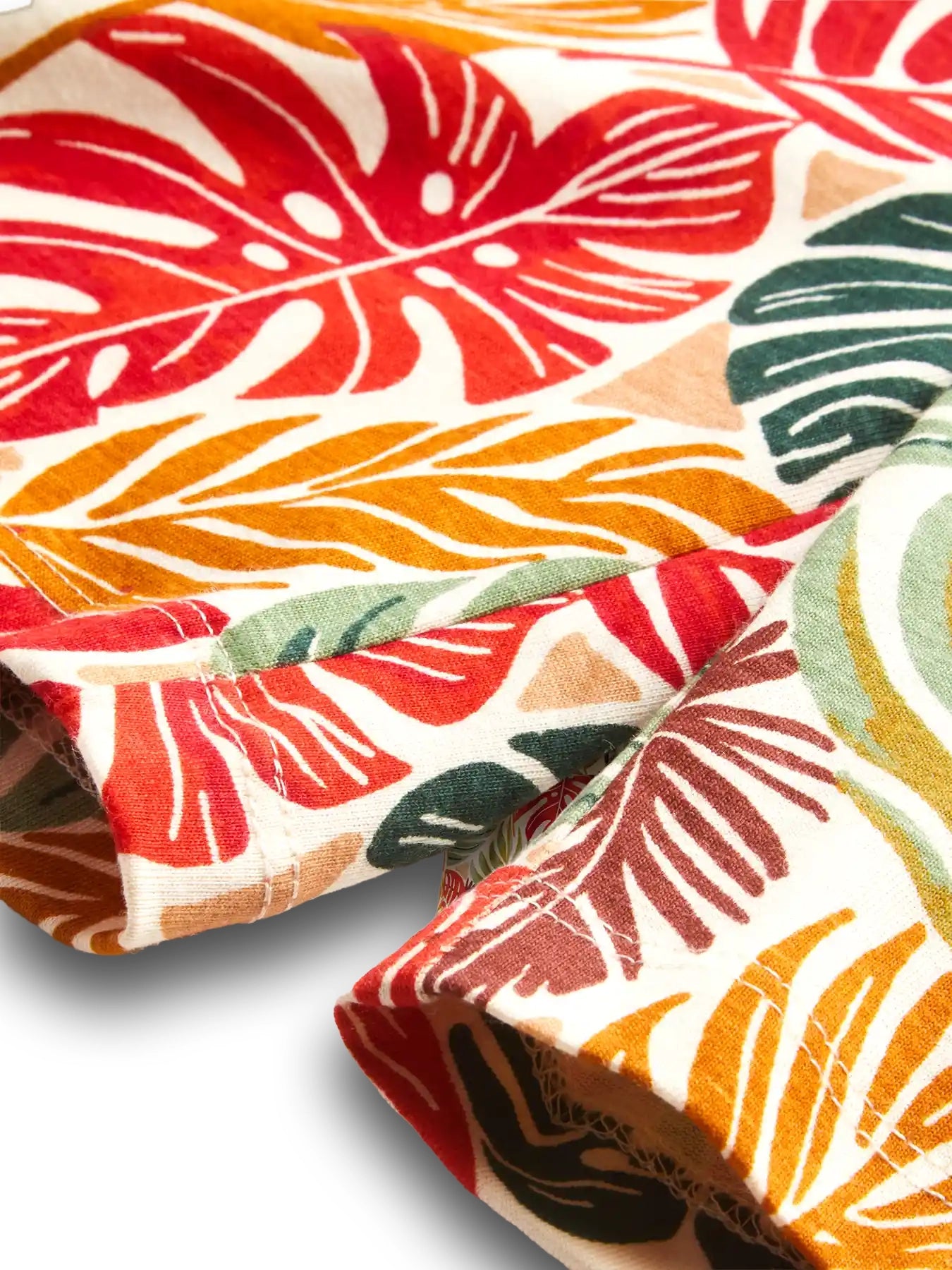 Tropical and refreshing, this palm leaf print set is perfect for sunny days. Its soft cotton fabric ensures comfort, while the leafy design adds a stylish holiday-ready touch.