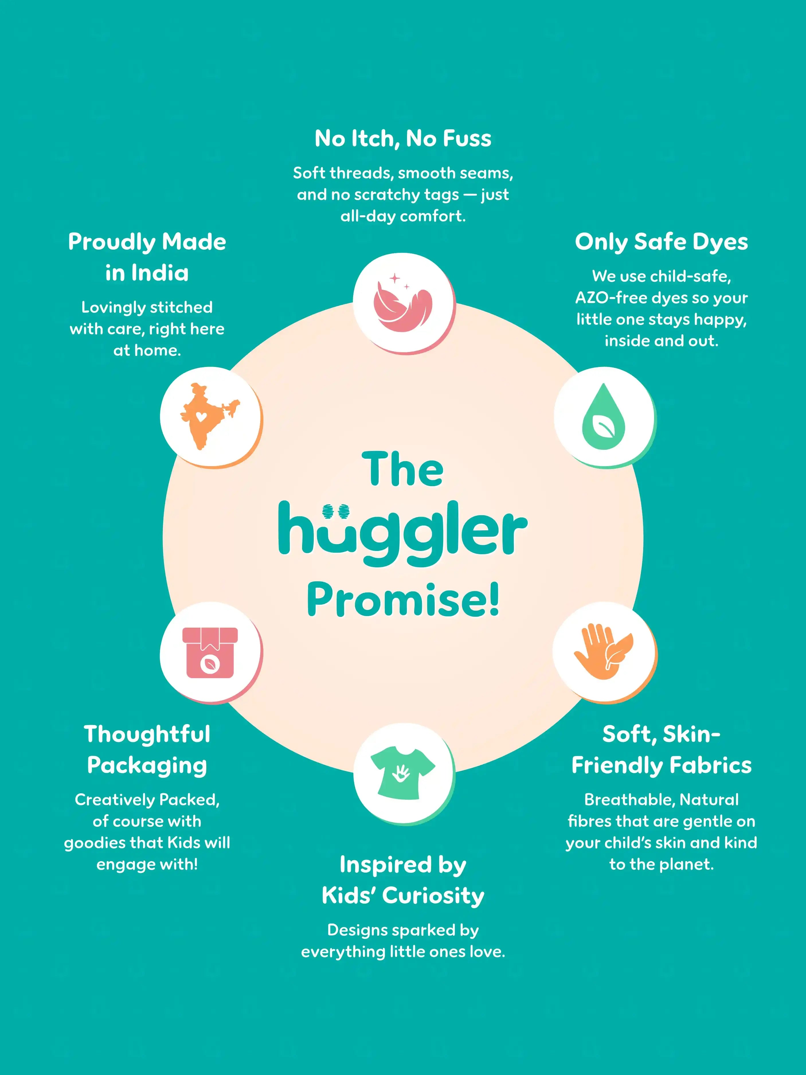 We use Soft, breathable 100% Organic Cotton to ensure comfort and durability for your Childβs sensitive Skin